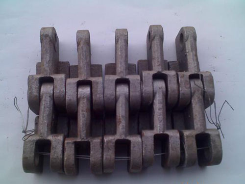 鱗片式爐排適用于蒸發(fā)量10~60t/h的鍋爐.其爐排面通常由4~12根互相平行的鏈條(類似自行車上的鏈條結構)組成.每根鏈條用鋤栓將若干個由大環(huán)、小環(huán)、墊圈、襯管等元件組成的鏈條串在一起.往復爐排通過夾板組裝在鏈條上,前后交疊,相互緊貼,呈魚鱗狀。
